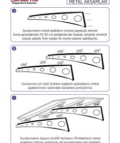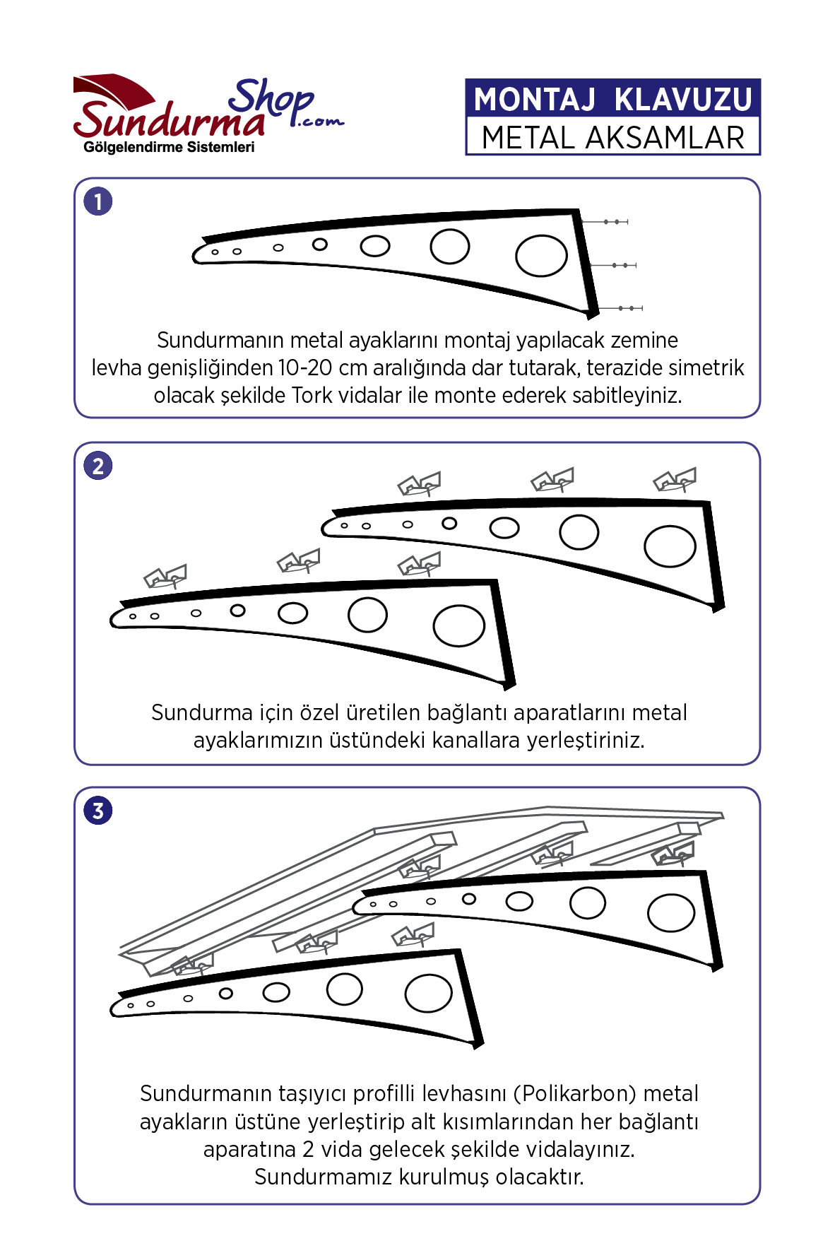 Tork vidalar ile ayaklar monte edilip sabitlendikten sonra Metal çerçeveli levhada bulunan metal taşıyıcılar ayaklar üstündeki hareketli bağlantı elamanlarına vidalanır. Bütün vidalar eksiksiz takıldıktan sonra Sundurmamız tamamlanmış olur.