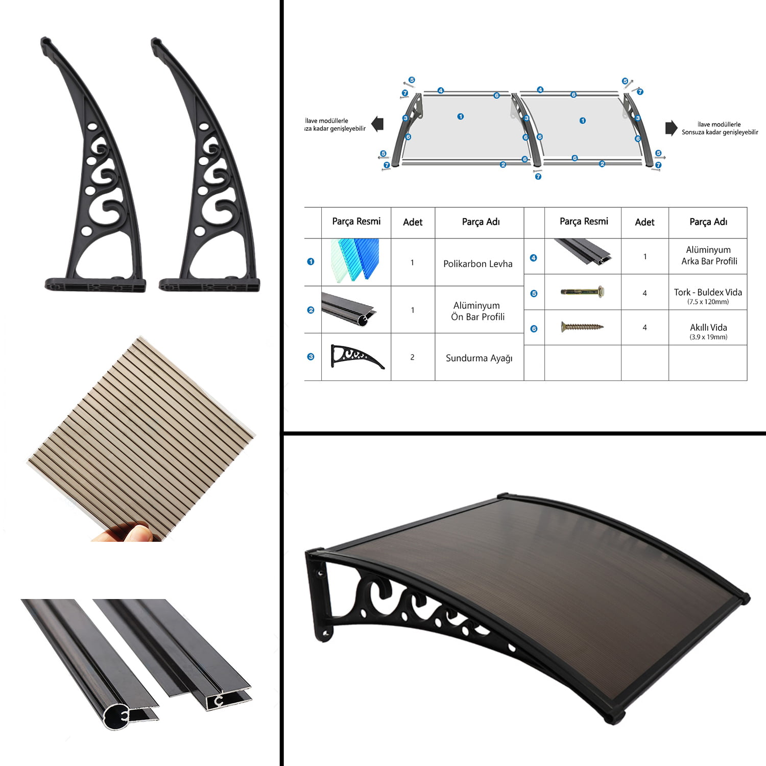 2 adet 100 cm Siyah plastik ayak + 1 adet 6 mm bronz polikarbon levha + 1 takım 100 cm Siyah alüminyum bar + 4 adet 120’lik Buldex vida + 4 adet bağlantı vidası + 4 adet pul + 4 adet tapa + Kurulum sayfası