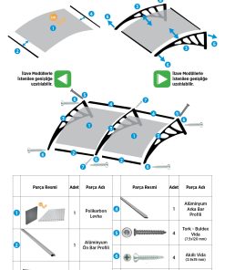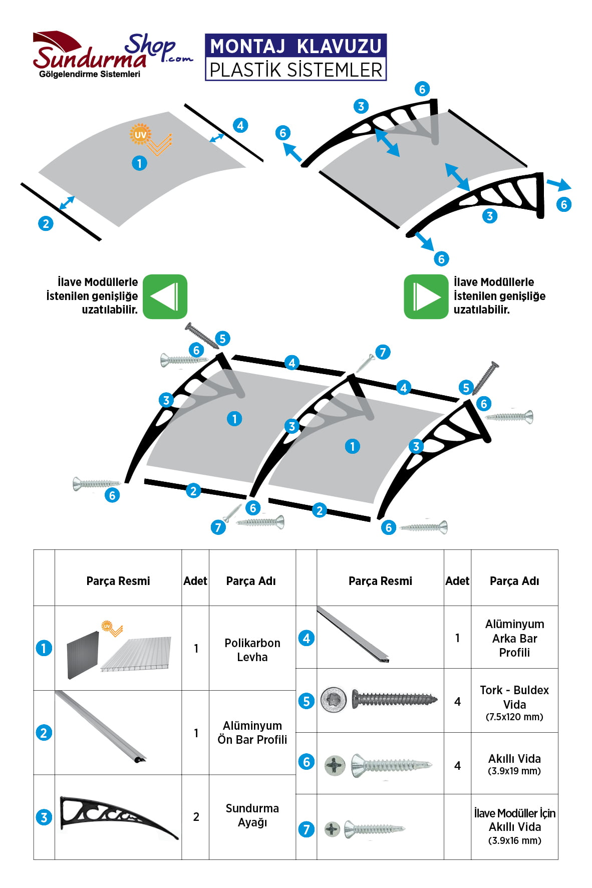 6 mm polikarbon levha, ön ve arka alüminyum profillere yerleştirilir. Profiller, sağ ve sol plastik ayakların özel kanallarına oturtularak Akıllı vidalar ile sabitlenir. Montaj yapılacak alanda ayak delikleri işaretlenir, prova alınarak delikler açılır. Ayaklar Tork vidalar ile yüzeye sabitlenir.